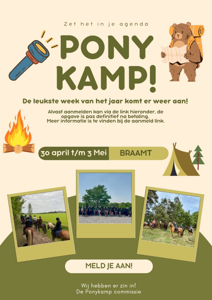 Het duurt nog even, maar de leukste week van het jaar komt er weer aan! Ponykamp! Volgend jaar word het kamp gehouden van 30 april t/m 3 mei, zet het in je agenda en houd er rekening mee met de vakantie! We gaan naar een stal in Braamt, achter Doetinchem. Om daar te kunnen buitenrijden heb je een ruiterlabel nodig. Meer informatie volgt daar over.